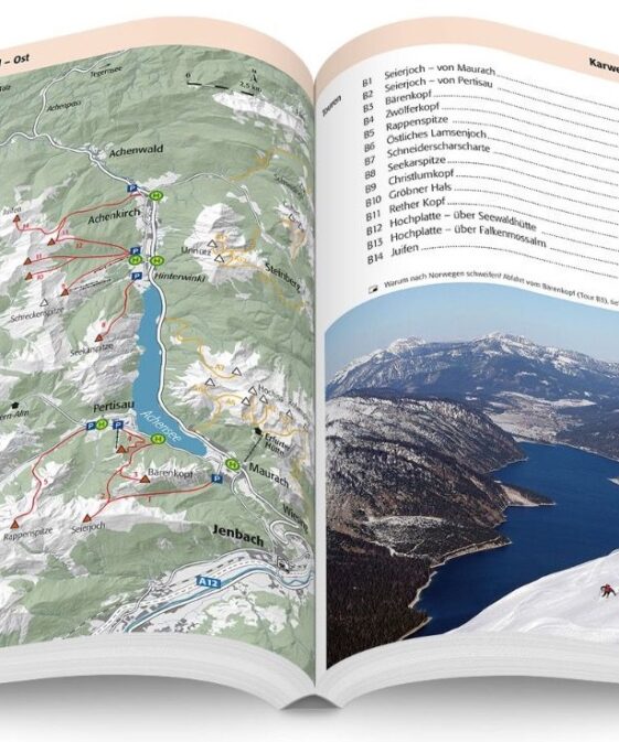 Karwendel, Rofan, Wetterstein, plus die Berge zwischen Tegernsee und Füssen – viel Gebirge in einem Band, und eine große Vielfalt: Während man in den Voralpen sanfte Wald- und Wiesenberge antrifft, ragen im Wetterstein, im Karwendel und im Rofan hohe Felsmassive mit wilden Karen und schroffen Steilflanken in den Himmel. Zahlreiche Skitouren sind gut für Anfänger und Gelegenheitstourengeher geeignet, und in den höheren Gebieten finden erfahrene Skibergsteiger eine schier unerschöpfliche Spielwiese.
