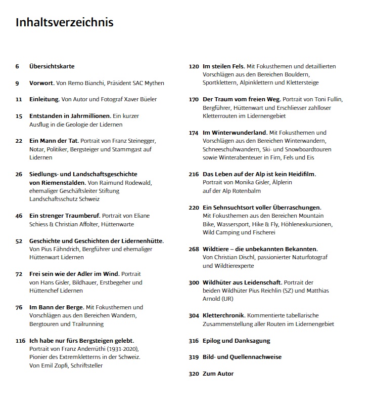Die Lidernen ist Lebensraum, Bergheimat und Sehnsuchtsort vieler spannender Persönlichkeiten. Der Mann der Tat Franz Steinegger, der Urner Bergmensch Toni Fullin, die Älplerin Monika Gisler, die Wildhüter Pius Reichlin und Matthias Arnold und natürlich das Hüttenwartspaar Eliane Schiess und Christian Affolter – ihnen allen widmet Xaver Büeler ein einfühlsames Porträt. Mit Emil Zopfi, Raimund Rodewald und Christian Dischl kommen auch brillante Gastautoren zu Wort. Ihre Betrachtungen zum Pionier des Schweizer Extremkletterns Franz Anderrüthi, der Siedlungsgeschichte des Riemenstaldner Tals sowie den Wildtieren bescheren der Lidernen-Monografie eine ausserordentliche Themenvielfalt.