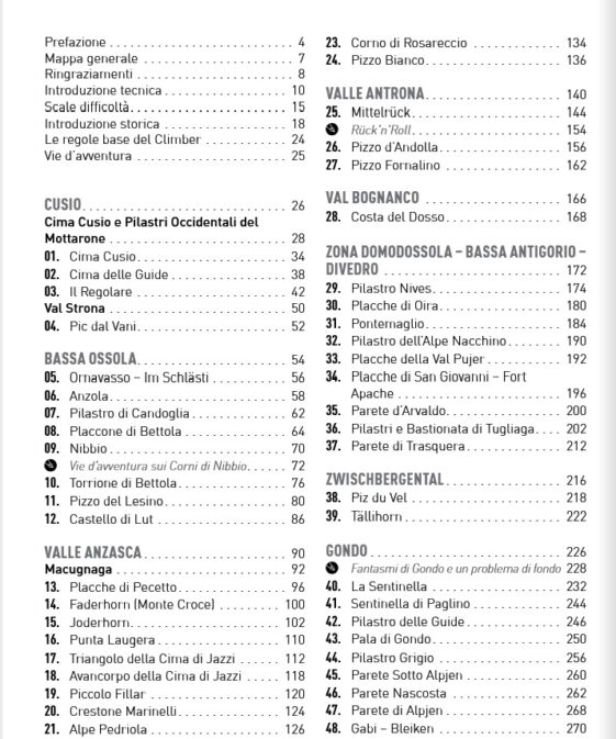 Zahlreiche Neuheiten werden vorgestellt, darunter einige talnahe Touren und auch alpine Routen wie Rück’n’Roll. Einige abenteuerliche, abgelegene Wände wie der Pizzo Fornalino und die Corni di Nibbio werden in modernem Stil wiederentdeckt.