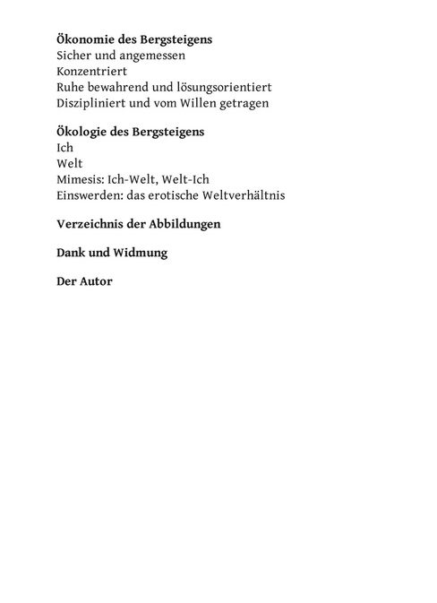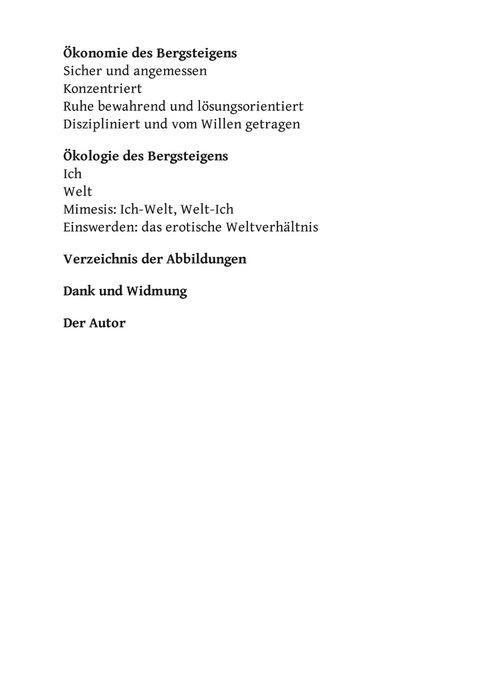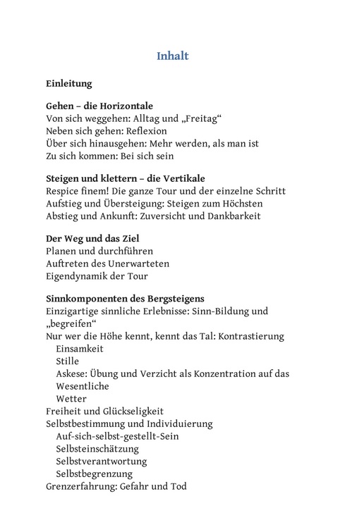 Bergsteigen ist konzentriertes Tun. Bergsteigen ist konzentriertes Leben. Es verdichten sich: Zeit, Aufmerksamkeit, Sinnlichkeit, Nachdenklichkeit; es intensiviert sich die Beziehung von Mensch und Welt. Was Natur ist und was der Mensch kann, erfährt man beim Bergsteigen nachdrücklicher als in der Ebene des Alltags. Dieses konzentrierte Tun und innige Weltverhältnis vermag auf das alltägliche Leben in der Ebene zurückzustrahlen, sodass auch dieses bereichert wird und in neuem Licht erscheint.