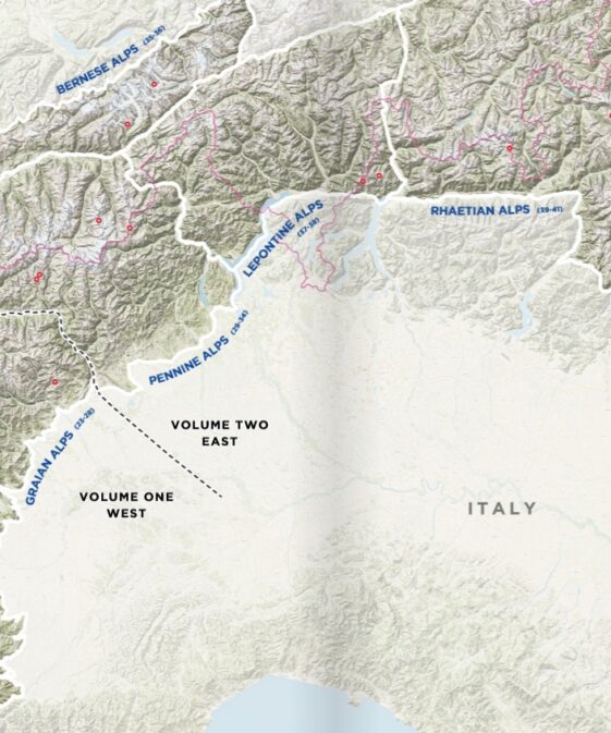 Volume Two continues eastward from Mont Blanc through the Pennine Alps (Valais and Aosta), Bernese Alps, Lepontine and Rhaetian Alps (Bernina and Ortler) and all the way to the Dolomites.