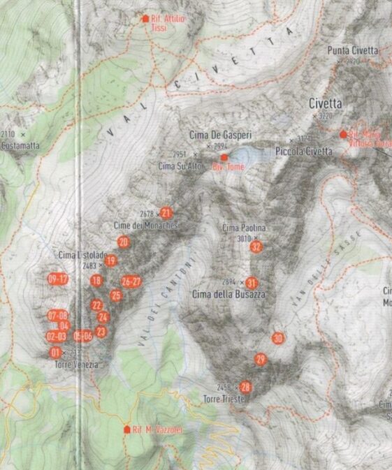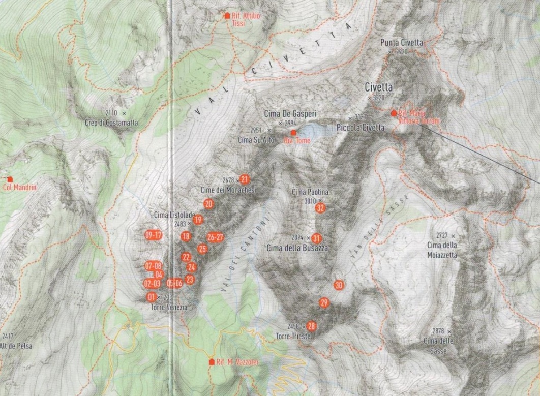 Die Südseite der Civetta ist eine sehr komplexe Gebirgslandschaft. Auf topografischen Karten ähnelt das Hauptmassiv einer riesigen Kralle, die mit drei Gliedern in Richtung Süden und einem nach Norden ausgerichtet ist. Die Gipfel im Süden sind weniger hoch, deshalb ist der Zugang aus dieser Richtung auch der bequemste. Aber dennoch trifft man hier auf sehr hohe, senkrechte Wände und Felsformationen aus kompaktem Kalkstein. Spitze Zinnen und Nadeln, schlanke Türme, klotzige Pfeiler und isolierte Gipfel kennzeichnen zwar die gesamten Dolomiten, aber auch die berühmteren unter ihnen sind, verglichen mit dem Torre Trieste (ca. 700 Meter Höhe) oder der Busazza-Kante (ca. 1100 Meter Höhe), eher kleine Grenzsteine.