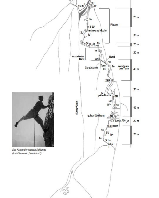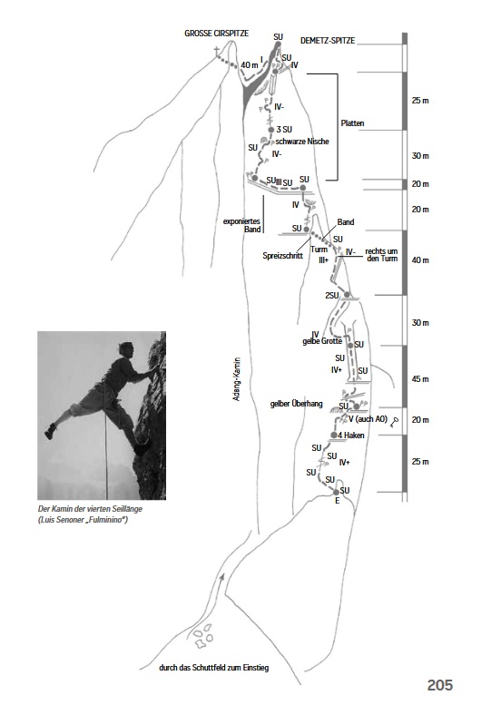 Der Verlauf der Tour ist einerseits auf Fotos und andererseits in detaillierten Skizzen eingezeichnet – Seillänge für Seillänge – inklusive Schwierigkeitsangaben und Angabe der Felsformationen entlang der Kletterroute.