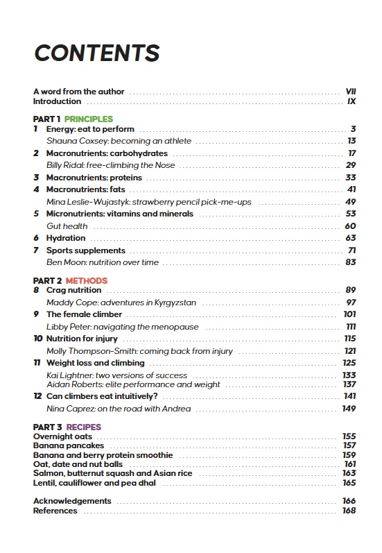The methods section shows you how to apply these principles in real life, with a focus on flexibility and autonomy. Specific chapters look at crag nutrition, injury recovery, weight loss, intuitive eating and the specific needs of female climbers.