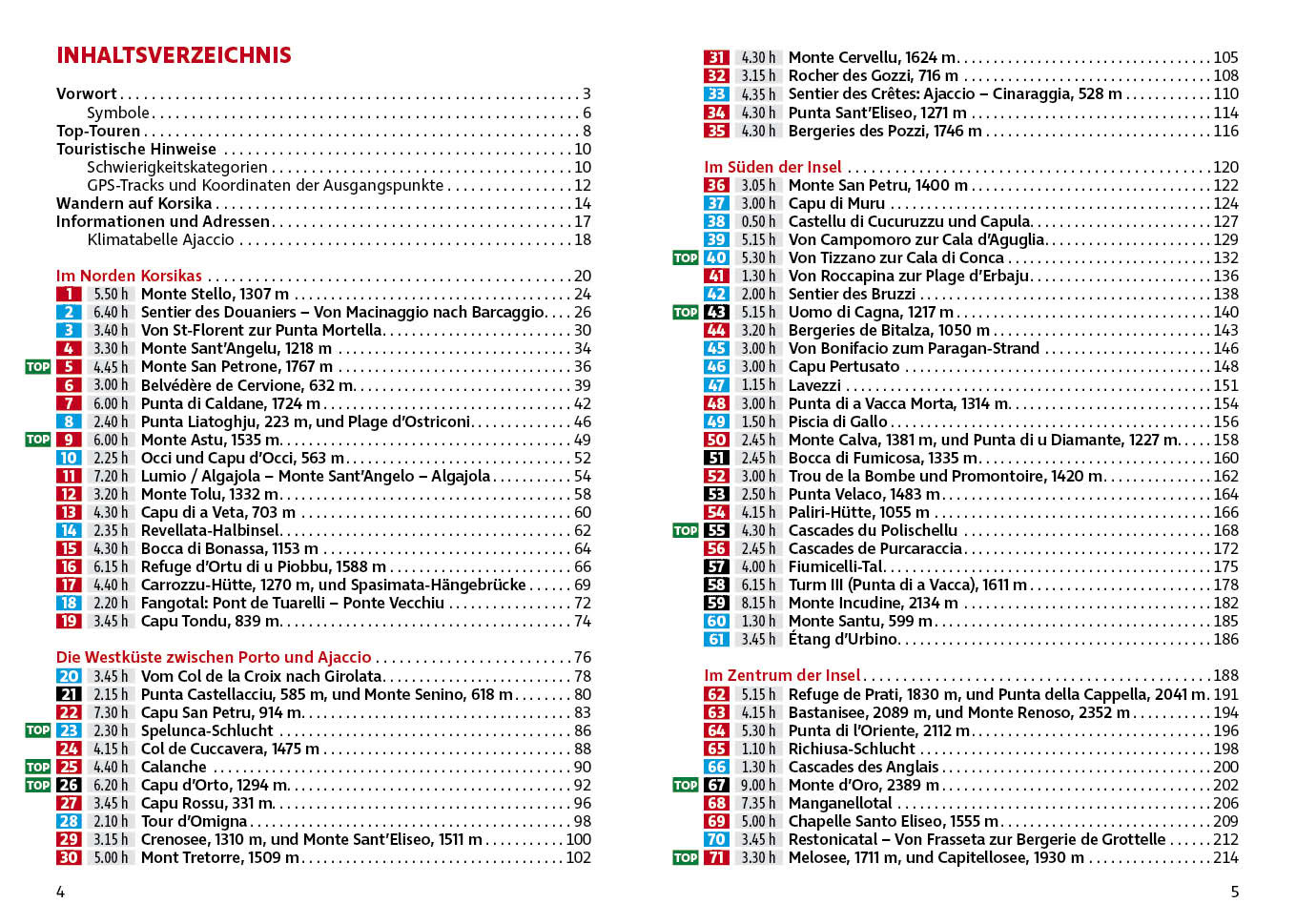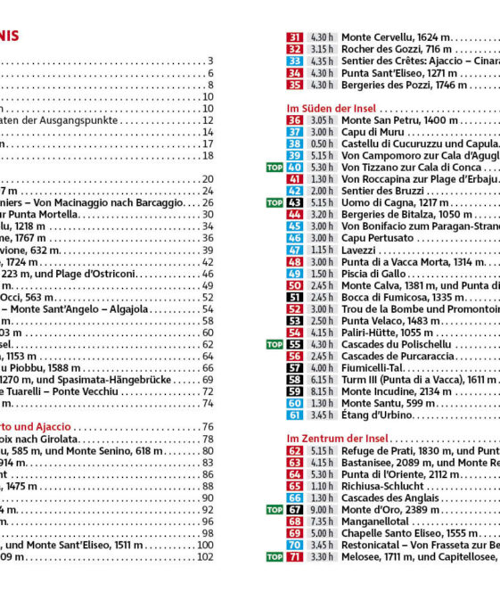 Die Tourenauswahl reicht von genussvollen Spaziergängen bis zu anspruchsvollen Bergabenteuern – ideal für Einsteiger, Familien und erfahrene Alpinisten gleichermaßen. Jede Wanderung ist mit einer präzisen Wegbeschreibung, einem Kartenausschnitt mit Routenverlauf und einem Höhenprofil ausgestattet. GPS-Tracks stehen zum Download bereit und helfen bei der Orientierung in der korsischen Bergwelt.