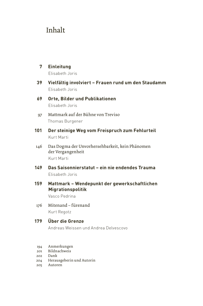 Die Herausgeberin Elisabeth Joris lässt die als Arbeitnehmerinnen oder Familienangehörige in den Bau des Staudamms involvierten Frauen zu Wort kommen. Sie beleuchtet zudem die Unterschiede in der Erinnerungskultur. Während Mattmark in Italien Sinnbild für ein vermeidbares Unglück geblieben ist, steht es in der Schweiz heute vorwiegend für einen beliebten Wanderweg. Diese Verbindung zwischen dem Saastal und dem italienischen Macugnaga diente laut Andreas Weissen früher als Schmugglerpfad.