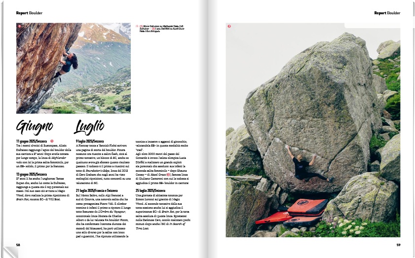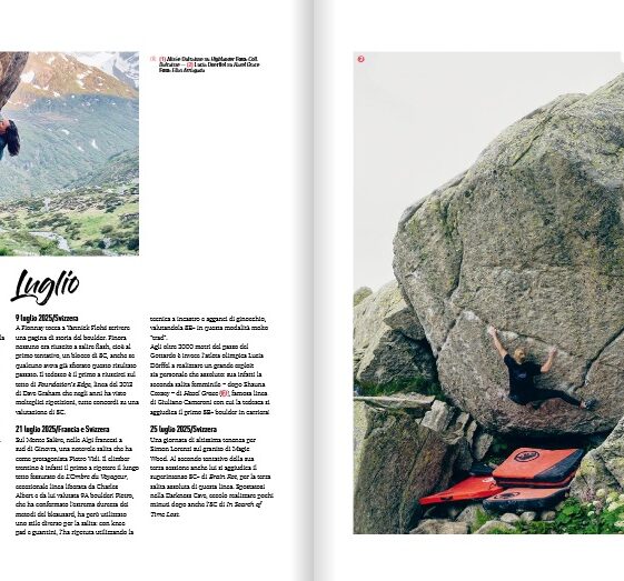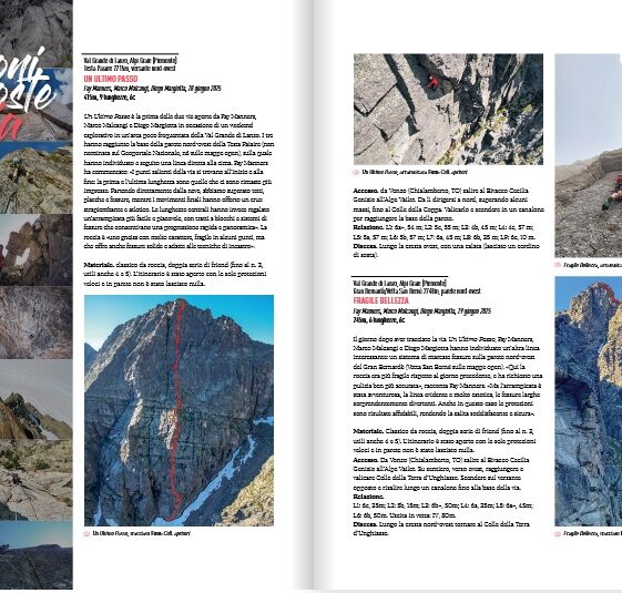 Infine, un must è la nostra usuale raccolta delle relazioni di nuove vie alpinistiche su roccia, ghiaccio e misto e di falesie, in modo da trarre spunti sempre nuovi nello scegliere destinazioni adatte alle nostre “visioni”. Un contributo fondamentale l’hanno dato, come ogni anno, i tanti climber e fotografi che ci hanno aiutato nel raccogliere il materiale qui pubblicato e che per questo ringraziamo sentitamente.