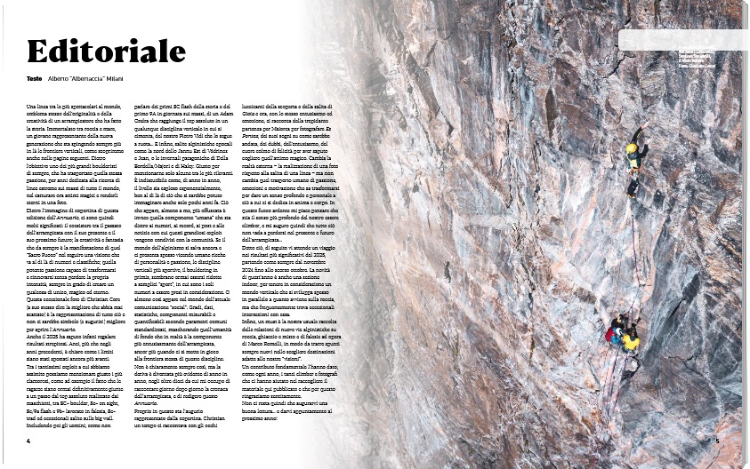Non è chiaramente sempre così, ma la deriva è diventata più evidente di anno in anno. Proprio in questo sta l’augurio rappresentato dalla copertina. Christian un tempo ci raccontava con gli occhi luccicanti della scoperta e della salita di Gioia e ora, con lo stesso entusiasmo ed emozione, ci racconta della trepidante partenza per Maiorca per fotografare Es Pontas, dei suoi sogni su come sarebbe andata, dei dubbi, dell’entusiasmo, del cuore colmo di felicità per aver saputo cogliere quell’attimo magico.