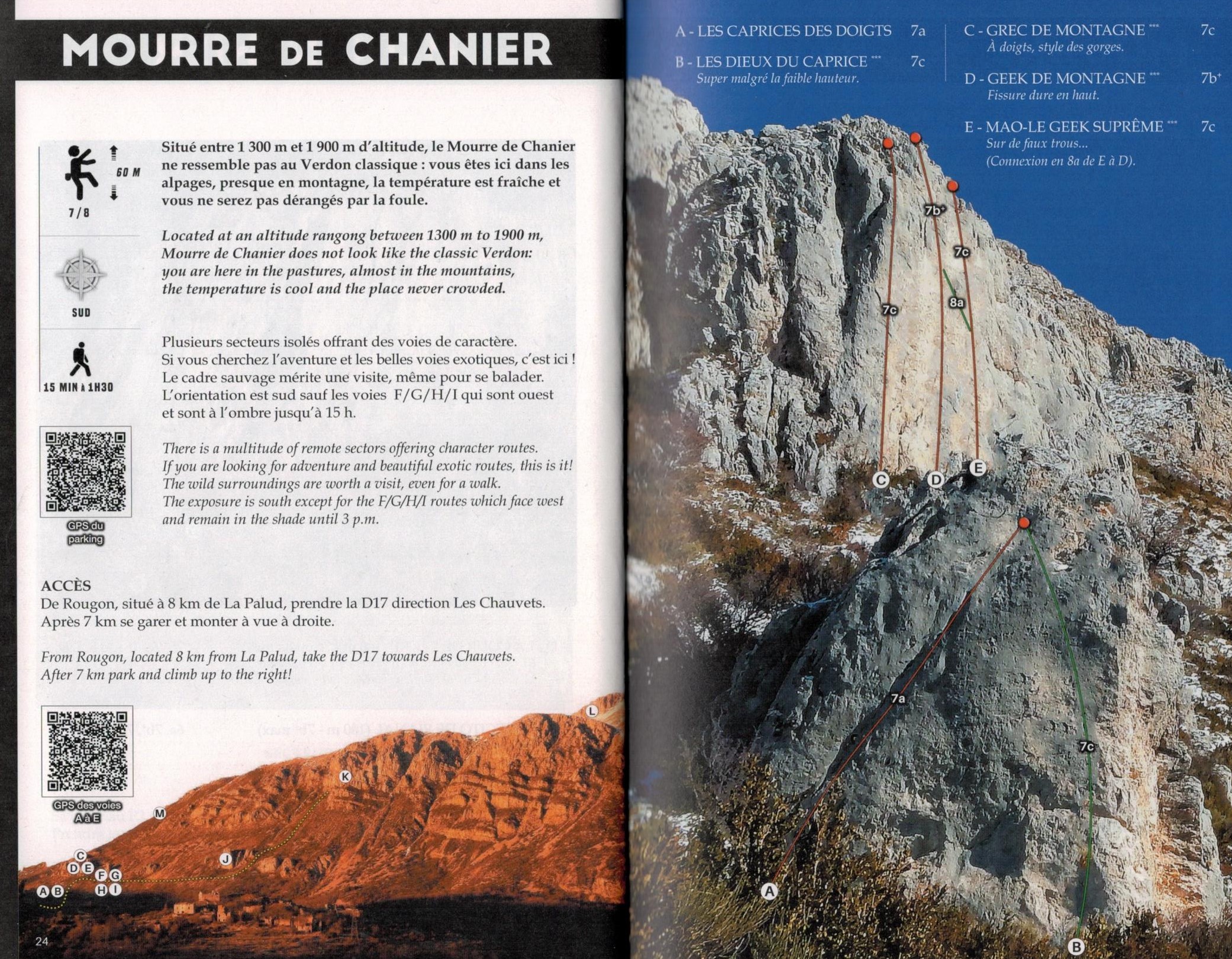 The design / layout is the same: each sector is briefly described. Pictograms support the selection and quickly tell you how long it takes to get there, how the sector is aligned, the maximum length of the routes and the prevailing levels of difficulty. The topos are clearly laid out on color photos of the respective walls. Of course, the topos are accompanied by routes with difficulty and names. In addition, QR codes help you navigate to the parking lot and the wall.